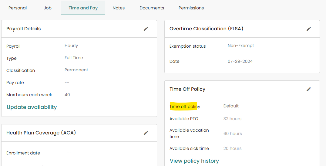 Note: You can also assign employees to time off policies from the Time and Pay tab of each employees directory profile. Edit the Time Off Policy section in the selected profile to quickly assign the employee to any existing policy in your account.