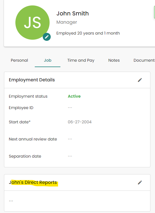 Note: You will only see the Direct Reports section in their Directory Profile if the staff member is fully assigned as a Supervisor in the Permission settings for Time & Attendance and Employee Records.