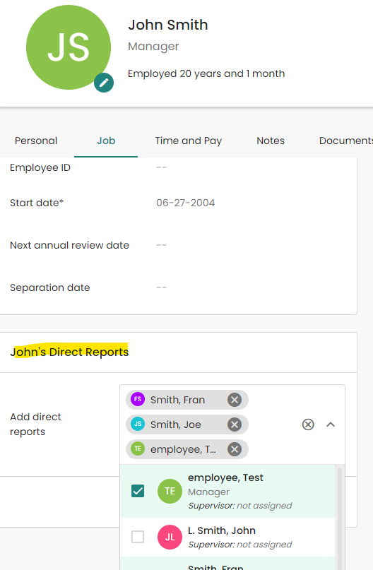 After a staff member is designated as a Supervisor, the account owner or an Admin will need to assign employees to them as their direct reports.