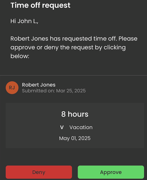 You can also use the Approve or Deny links in the time off request email notification to manage the request. Just click the Approve or Deny link in the email, sign in when prompted, and the system will immediately apply your selection.