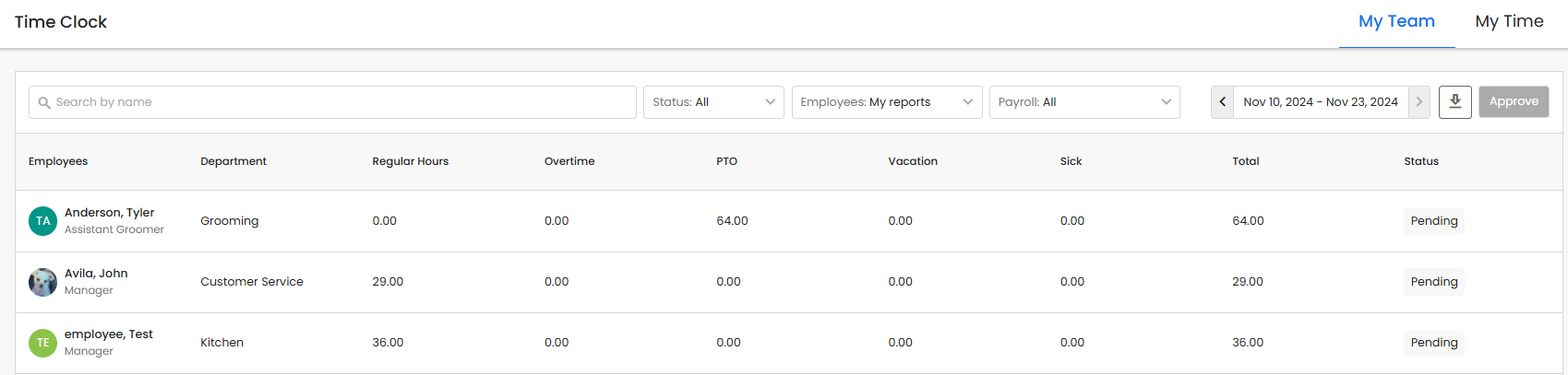 The My Team view tab of the time clock page will show you a summary of the hours worked for the currently selected time period, it will also show each time cards current approval status.
