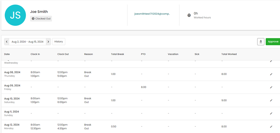To view an employees full timesheet, click on the desired employee from this summary page and the employees full timesheet will be visible.