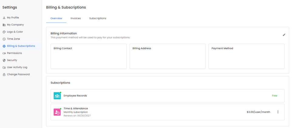 The overview tab shows an overview of your current billing information such as the billing contact person, billing address and payment method on file. The subscriptions section on the lower half of the page will also show an overview of any current subscriptions the business has within Personelle. You can also cancel any active paid subscriptions from here if ever needed.