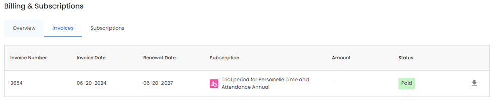 Invoices will post here whenever a charge is processed by your active subscriptions. If ever needed, you can download the invoices for your records by clicking the download icon to the right of each invoice listed.