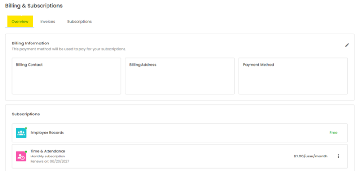 The billing & subscriptions overview tab shows an overview of the organizations current billing information such as the billing contact person, billing address and payment method on file. The subscriptions section on the lower half of the page will also show an overview of any current subscriptions the business has within Personelle. You can also cancel any active paid subscriptions from here if ever needed.