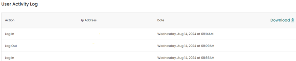 Here you can view a history of logins on your account, the date and time and the IP address that accessed the account. If desired, you can also download this data to your device by clicking the download icon in the upper right corner.