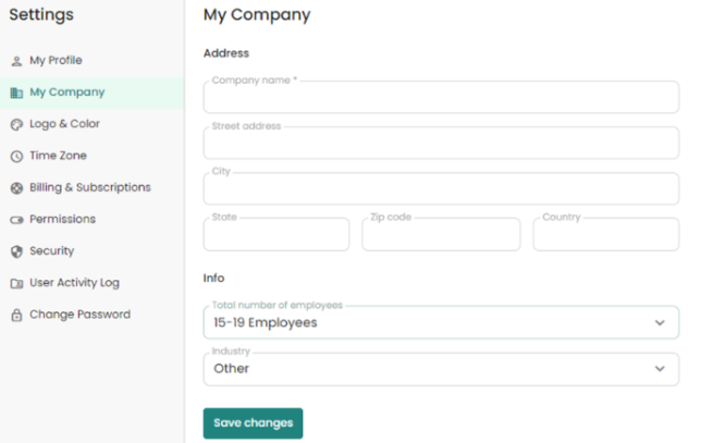 From here you can set up or edit the company name, mailing address, info on the total number of employees within the organization and the industry type.