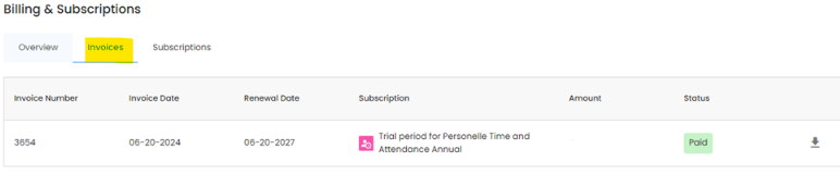 Invoices will post here whenever a charge is processed by your active subscriptions. You can download the invoices for your records by clicking the download icon to the right of each invoice listed.