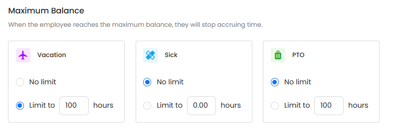 -Custom Maximum - Accruals stop once the employee hits the maximum balance.