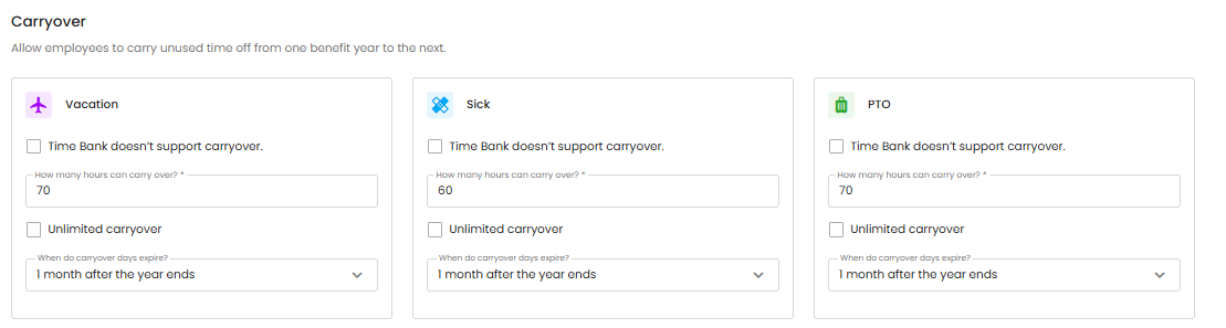 The Benefit Year controls when each time bank resets and when carryover (if allowed) is applied. When the benefit year restarts, balances reset based on your settings and carryover applies immediately if enabled.