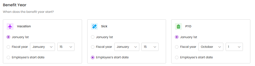 The Benefit Year controls when each time bank resets and when carryover (if allowed) is applied. When the benefit year restarts, balances reset based on your settings and carryover applies immediately if enabled.