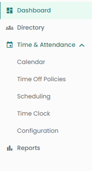 To the left of the dashboard, you'll find the navigation menu. Use this menu to move to other pages within Personelle. If your organization is subscribed to Personelle time & attendance, you will see additional menu options available.