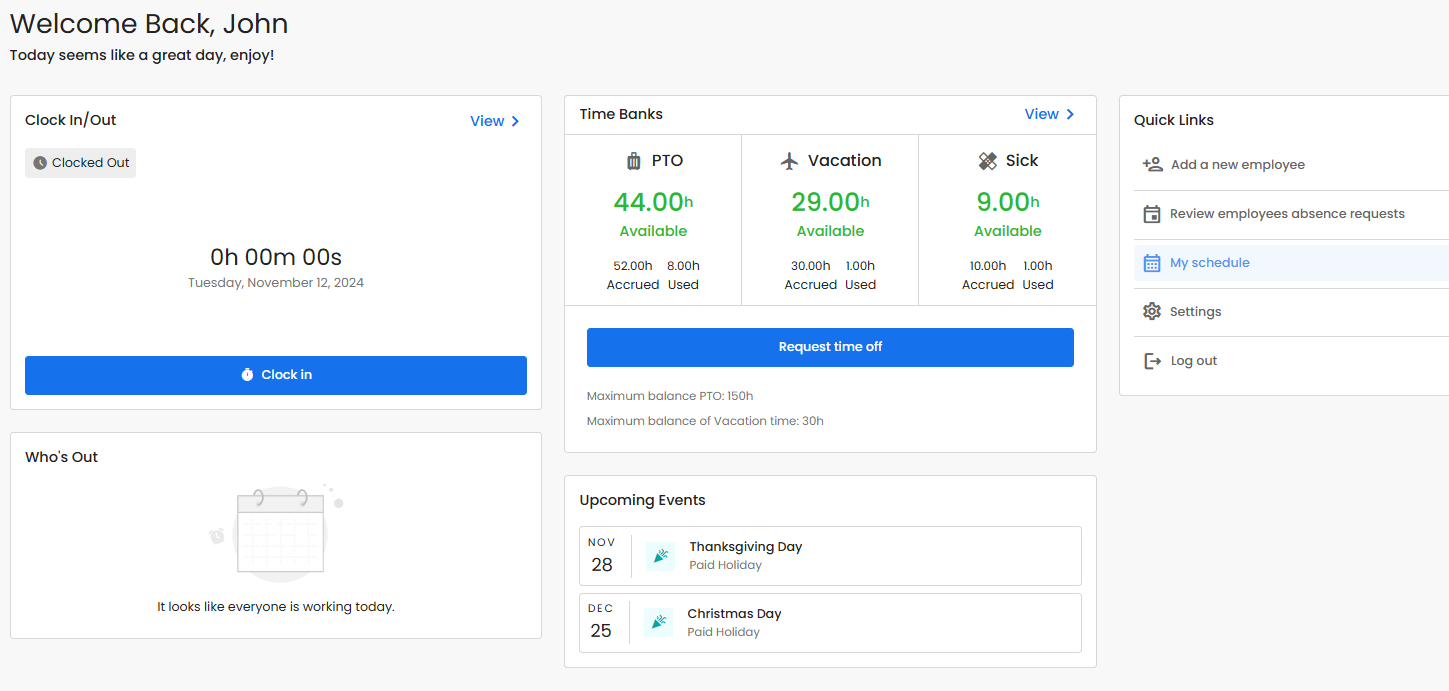 Note: Only the account owner and account admins will have access to the time off policies, configuration and reports tabs.