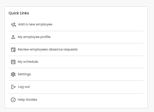 The Quick Links section appears on the main dashboard and provides fast access to the tools and pages used most often. For Account Owners and Admins, this includes shortcuts to: