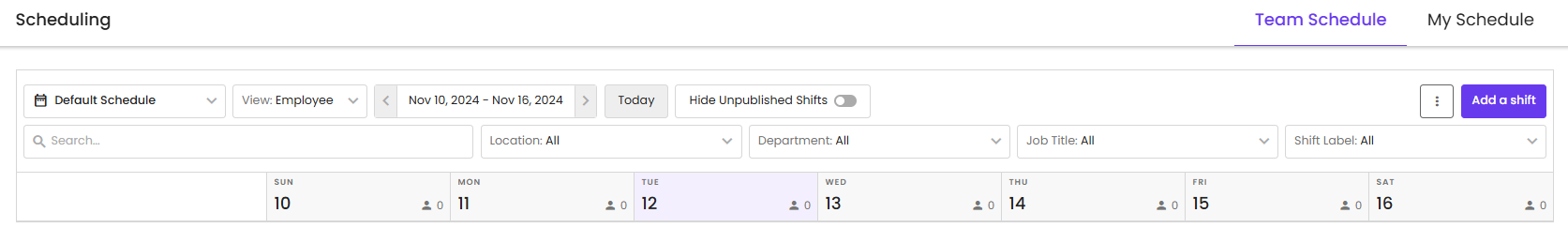 Account owners and admins can create weekly schedules and edit shifts for all staff members from the schedule page/team schedule view tab.