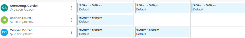 On the Team Schedule page, each employee scheduled will display two numbers next to their name to help with shift planning. The number on the left shows how many hours they are currently scheduled for, while the number on the right shows the maximum number of hours they are available to work each week. This makes it easy for schedule builders to quickly see how many hours an employee can still be assigned.