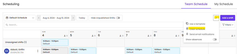 1. From the scheduling page/team schedule view tab, locate the schedule you want to clear in the calendar and then click on the three dot ellipsis symbol next to the 'Add A Shift' button.