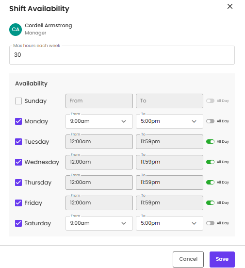 To update an employees availability and max amount of hours, select the 3 dot ellipsis symbol next to the employees name and then select edit availability. Employees can also access and edit their own availability from their 'My Schedule' page.
