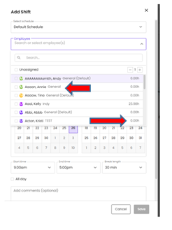 NOTE: To help with schedule planning, the employee selection menu will list the amount of hours currently scheduled for each employee in the selected schedule period.