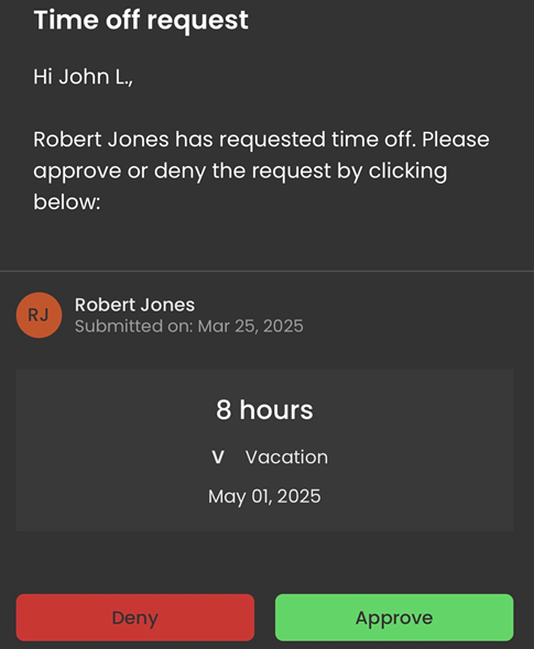 •Time off request emails now include auto Approve and Deny links. When you select one, you'll be prompted to log in, and the request will be approved or denied instantly based on your choice.