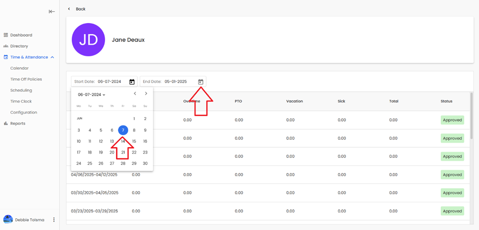 •Added ability to customize start and end dates for Time Sheet History feature.