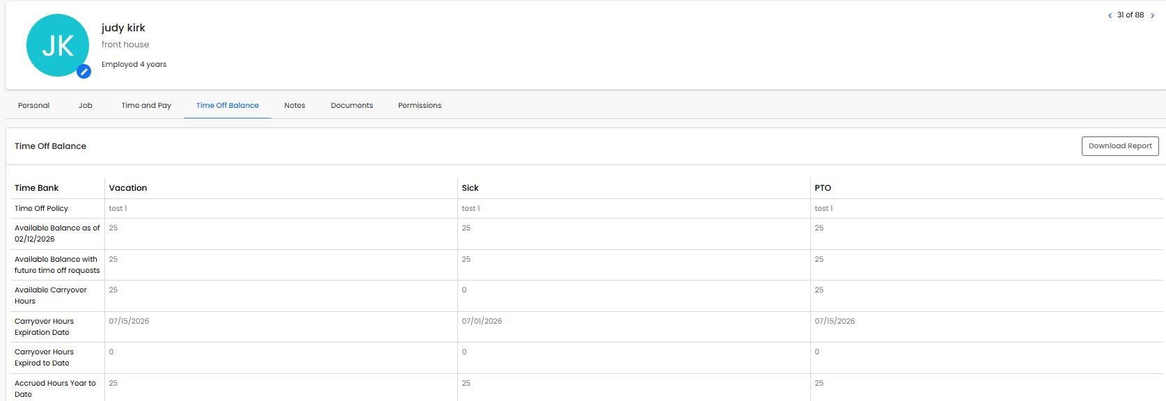 The time bank hour changes report tracks a history of changes within an employee's time banks such as when time is accrued and processed or when an employee is changed to a different time off policy plan.