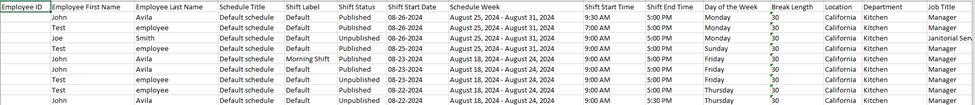 This report provides details of scheduled shifts for the time range and schedule title selected. Information on the employees, shifts, work locations, departments and job titles will be available in this report.