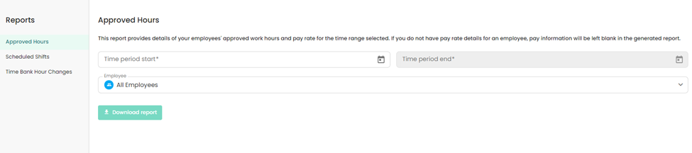 Note: The approved hours report will only show data for timesheets that have been approved and does not show detailed information on approved time off requests. To view time off request data, please review the article on managing absences and time off requests..