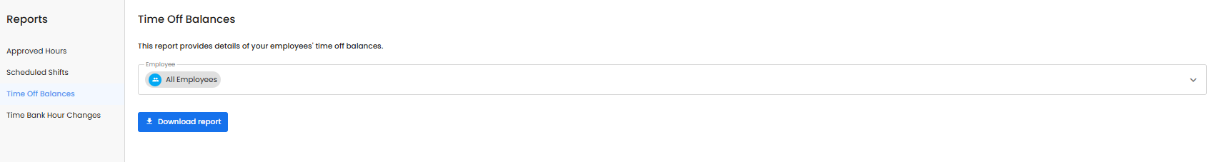 The time off balances report details your employee's time bank hours for the selected date range. The information in this report matches the data found in the Time Off Balance section of each employee's directory profile.